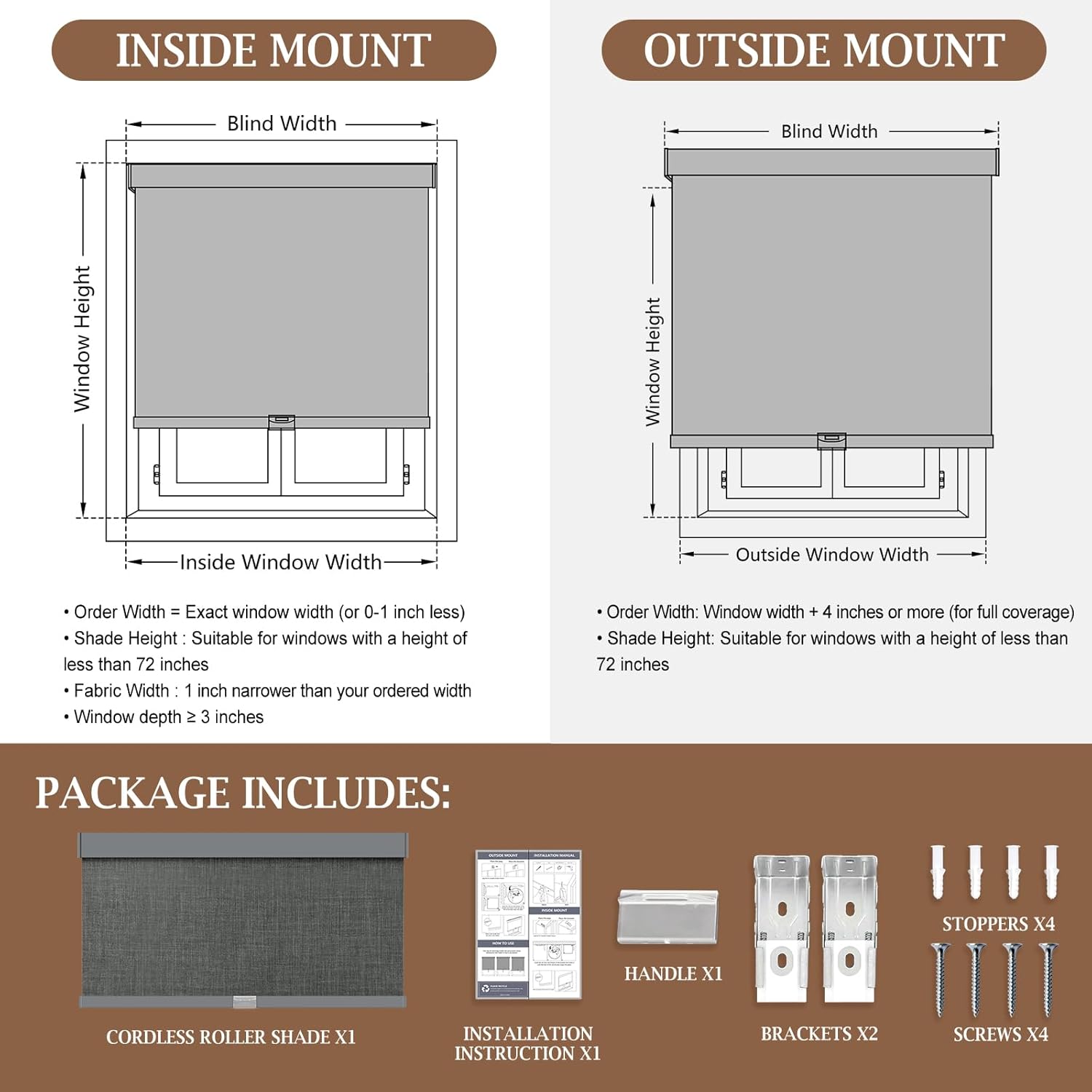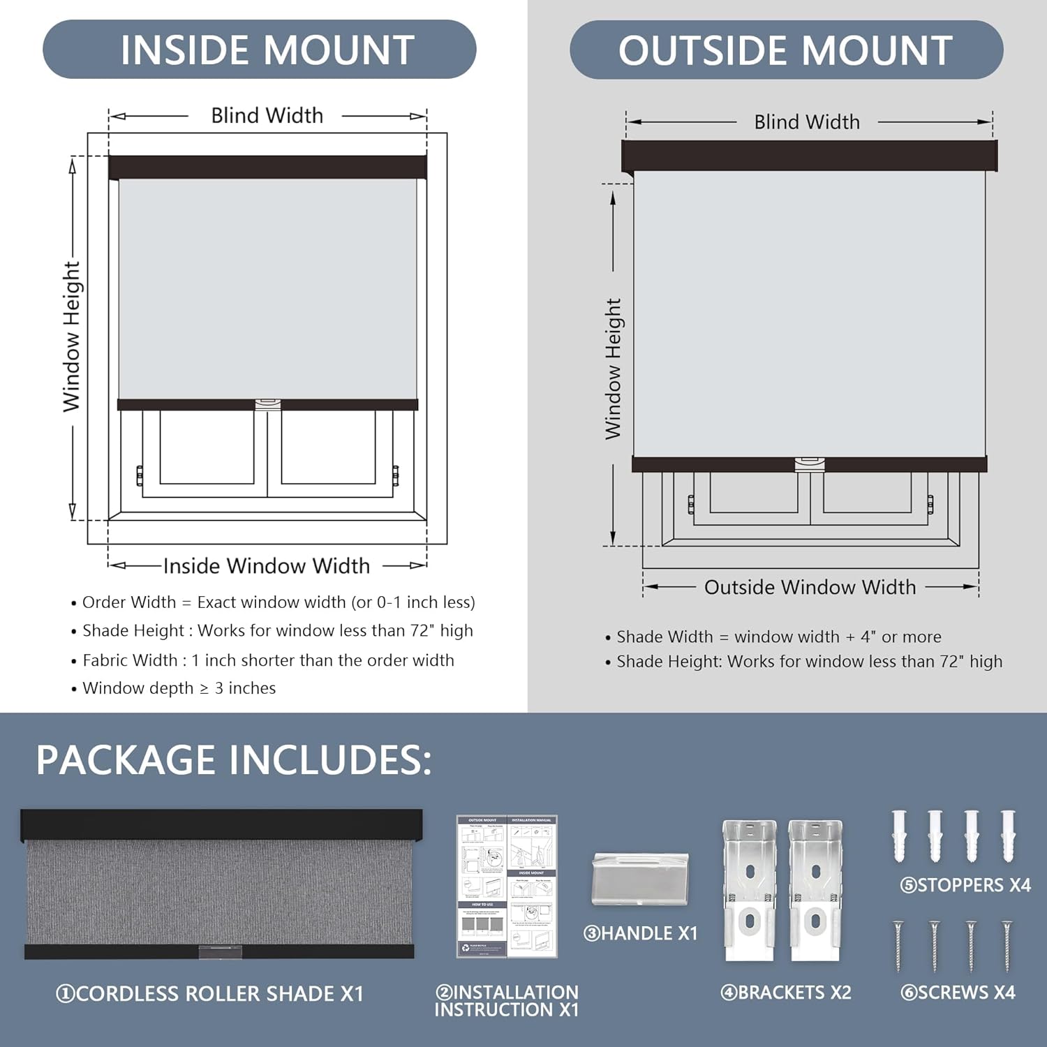 | Mounting Type | Inside Mount or Outside Mount |