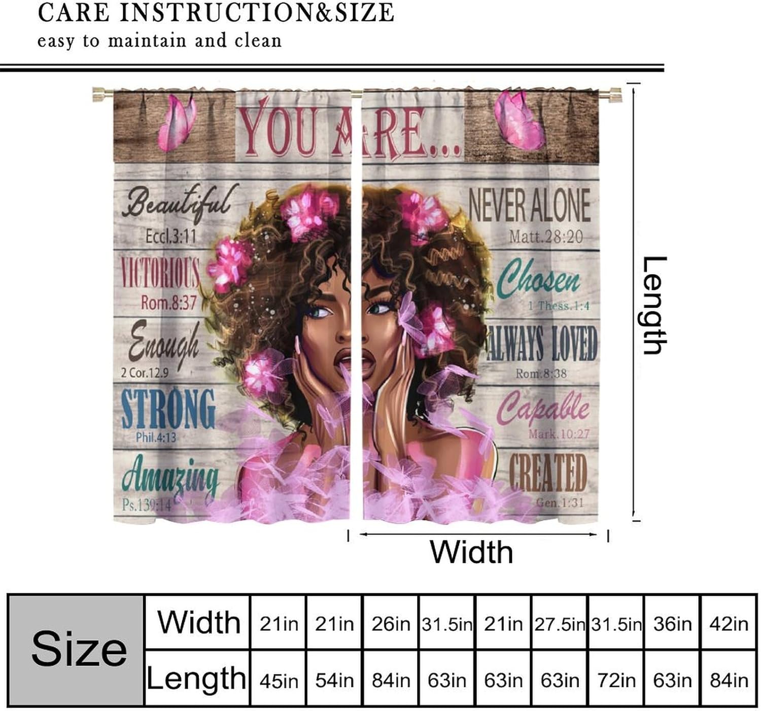 ✦Welcome to our store, thank you for choosing our store among many! We will do our best to provide you with high-quality service. The dimensions of our products have been marked below. If you don't have the size you want, you can consult us in the background, and we will provide you with timely service to customize the size you want.✦Our common sizes include nine types: 42x45 Inch, 42x63 Inch, 42x54 Inch, 52x84 Inch, 55x63 Inch, 63x72 Inch, 63x63 Inch, 72x63 Inch, and 84x168 Inch. The above are the total dimensions of two curtain panels.✦Our curtains are designed with Rod Pocket, easy to install, you can start installing it yourself after receiving the goods, easy to install and time-saving. Exquisite prints can decorate your home even more beautifully, and you can rest assured to choose our products. The material used is not prone to wrinkles and can be well cared for.