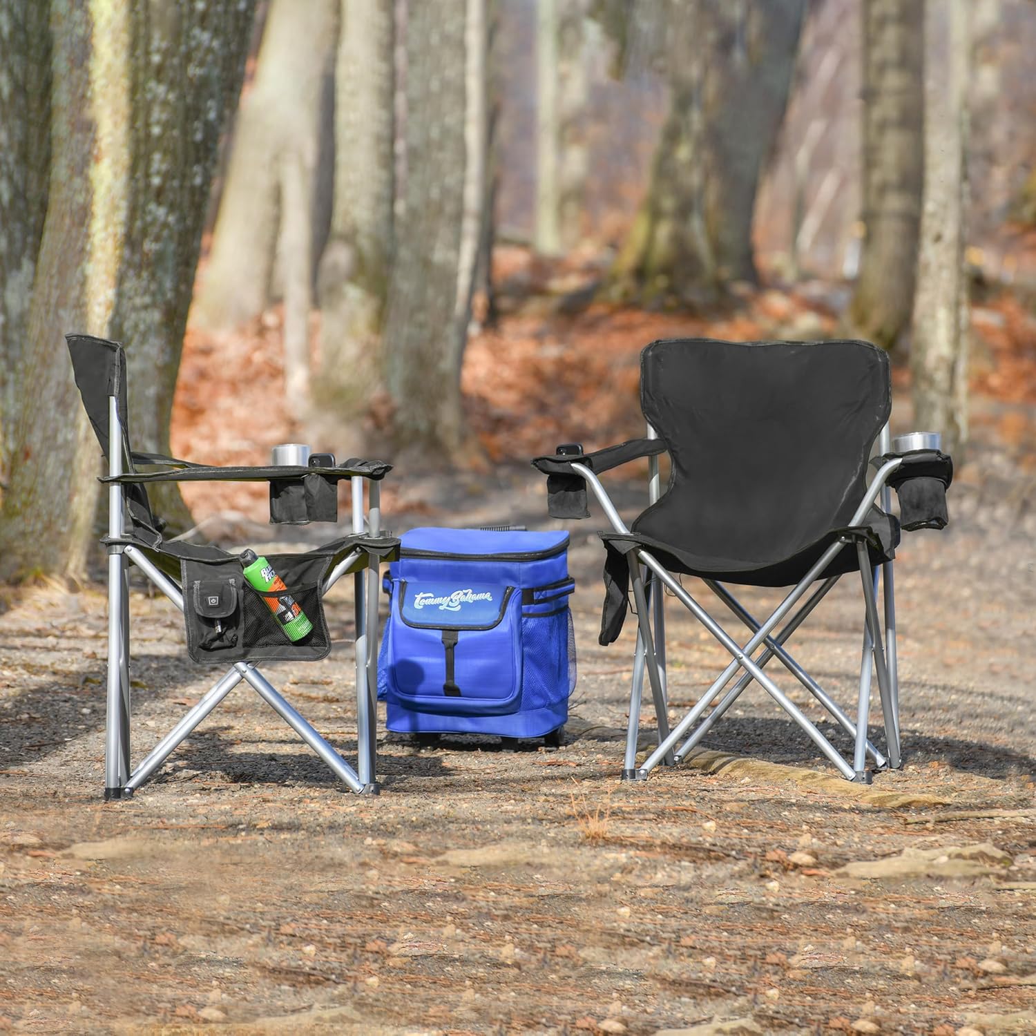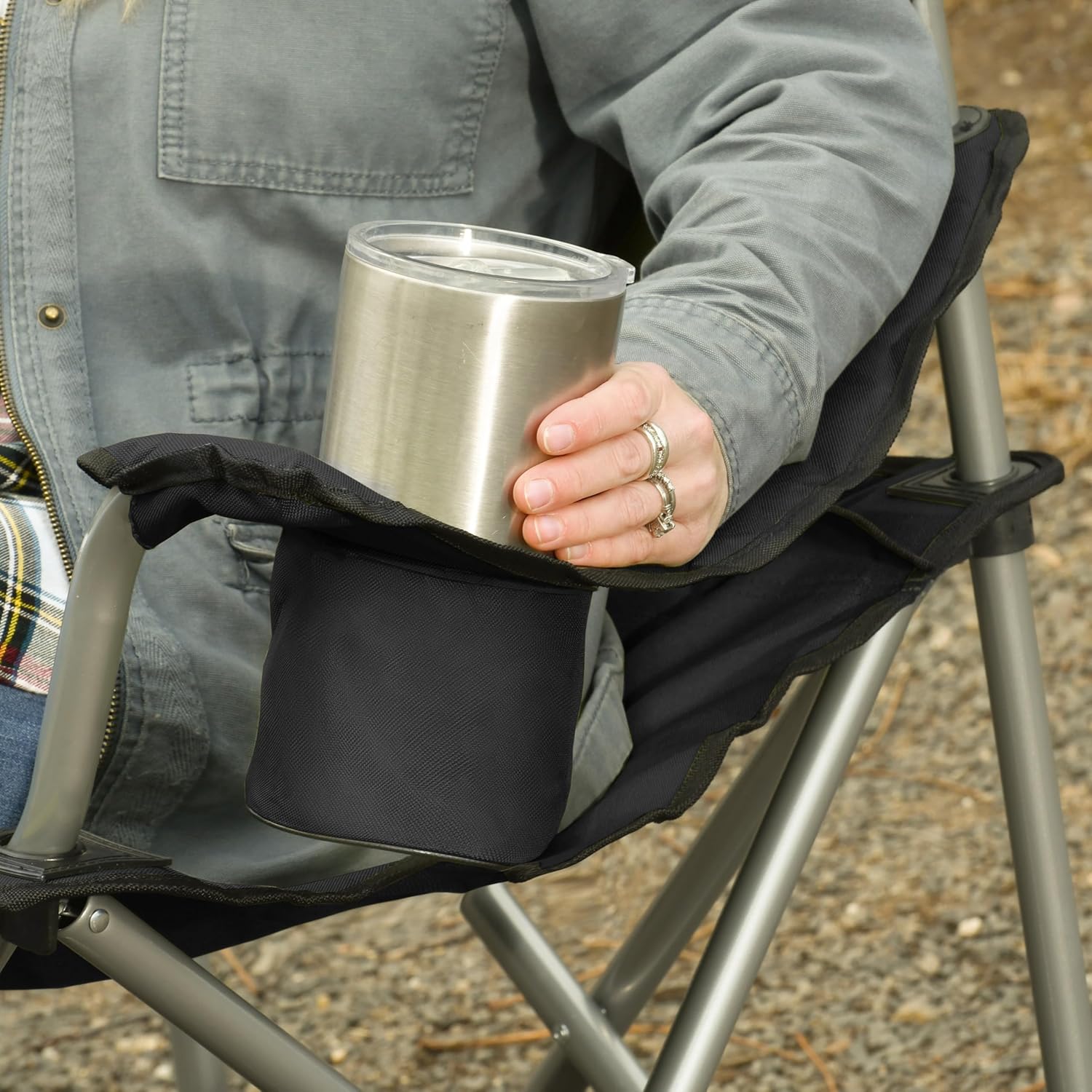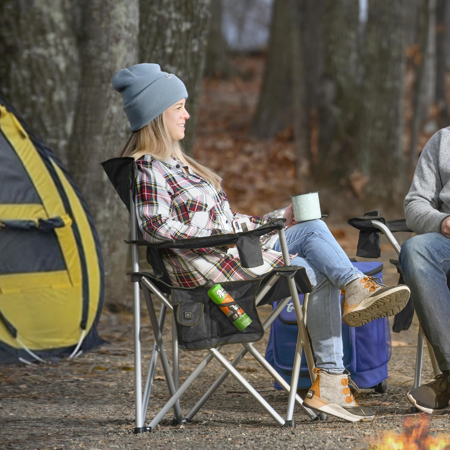 Make the most of your outdoor adventures with the CAMP & GO Heavy-Duty Heated Quad Chair. Weather you're going on a camping trip or fishing day or to a tailgate, picnic, bonfire, concert, or park, this portable heated chair will keep you warm and cozy on a cool night during all your outdoor excursions. Featuring multi-zone coil heating and anti-snap wiring technology, this foldable camping chair provides a greater warming area with 3 adjustable temperature settings for customized comfort where you need it most. It also includes an extra-long 18" USB cable that can be plugged into a nearby wall outlet or portable power bank for an easy way to stay warm no matter where you are. The large storage compartment attached to the chair offers a safe and convenient spot to store your valuables, and the oversized cup holder fits giant tumblers to allow you to keep your favorite drinks nearby and stay hydrated. Comfortable and durable, the taller arched back and wider shoulder area provide superior back and neck support, and the 1" steel frame with stain and moisture-resistant 600D Dobby fabric withstand long-term use outdoors and support up to 500 pounds. This durable outdoor camping chair makes a great and unique gift for camping enthusiasts, outdoor lovers, bird watchers, and more.