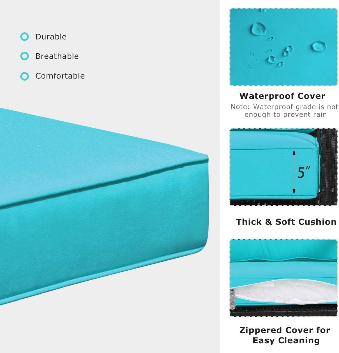 Description:Enjoy a cozy day with our outdoor rocking chair!With strong power coated iron and rattan, our patio rocker chair outdoor is suitable for patio, garden, poolside and backyard. The concise style and exquisite rattan also make the patio rocking become a modern and minimalist furniture to add a classy touch to your living room. You can feel the soft and thick cushions on the chair supporting you to relieve fatigue and give you a comfortable sitting experience. Made of power coated iron frame and rattan, the chair can ensure the stability and provide a long durable life to you. Besides, it is easy for you to clean the wicker, you just need to use a wet cloth to wipe it.Features:Thick and soft cushions are both for back and seat, providing a comfortable sitting experienceCushions can be fixed with tape and strings.Sturdy and durable steel frame with exquisite rattanYou can sway forward and back enjoying the comfortable lounging.Suitable for garden, backyard, patio and poolside and other indoor areasEasy to assemble and cleanSpecifications:Color of Cushion: Turquoise/ Red/ Orange/ Black/ GreySize of Rocking chair: 26.5” x 36” x 33” (L x W x H)Height of Armrest: 26”Height of Seat: 20”Thickness of Seat Cushion: 5”Thickness of Back Cushion: 3.5”Net Weight: 20 lbsWeight Capacity of Chairs: 360 lbsPackage Includes:1 x Rocking Chair1 x Back Cushion1 x Seat Cushion1 x Instruction