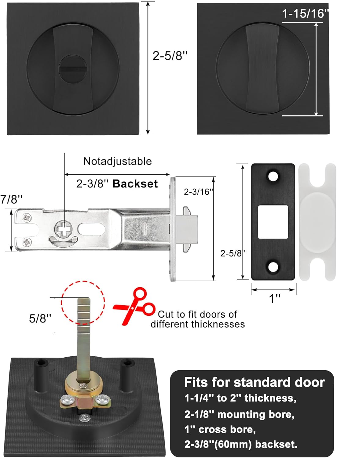 | Included Components | Latch, Pocket Door Hardware, Screws, Strike Plate, installation guide with sizing and hole templates |