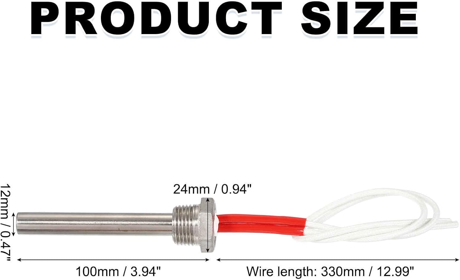 What is this?.This stainless steel immersion cartridge heater is a good replacement for the heating element, which is commonly used for heating water and other liquids in applications like water tanks and various industrial equipment. It is widely used in high temperature and highly corrosive environments (such as industrial equipment, laboratory instruments, food processing, chemical industry, etc.)What will I get?Material: Stainless SteelOverall Size: 430 x 24mm / 16.93 x 0.94 inch(LxW)Pipe + thread length: 100mm / 3.94 inchCartridge Heater diameter: 12mm / 0.47inchWire length: 330mm / 12.99inchThread specifications: 1/2"NPTRated power: 150W with +5% -10% ToleranceRated voltage: 12VPacking: 1Pcs x Immersion Cartridge Heater Electric with White flame-retardant heat-resistant wireAre there any advantages of the product?304 stainless steel heating plate is made of stainless steel, which has the characteristics of corrosion resistance, high temperature resistance, high mechanical strength (tensile strength 520MPa), etc. The electric water heating element features fast heating performance and is built with safety mechanisms for stable operation. Its design allows for simple installation and easy replacement.How to use it?Steps of installation: 1. Select the electric cartridge heater of appropriate specification; 2. Remove the cartridge heater to be replaced; 3. InstalledWhat should I notice?Please select the appropriate electric cartridge heater, especially the voltage and power