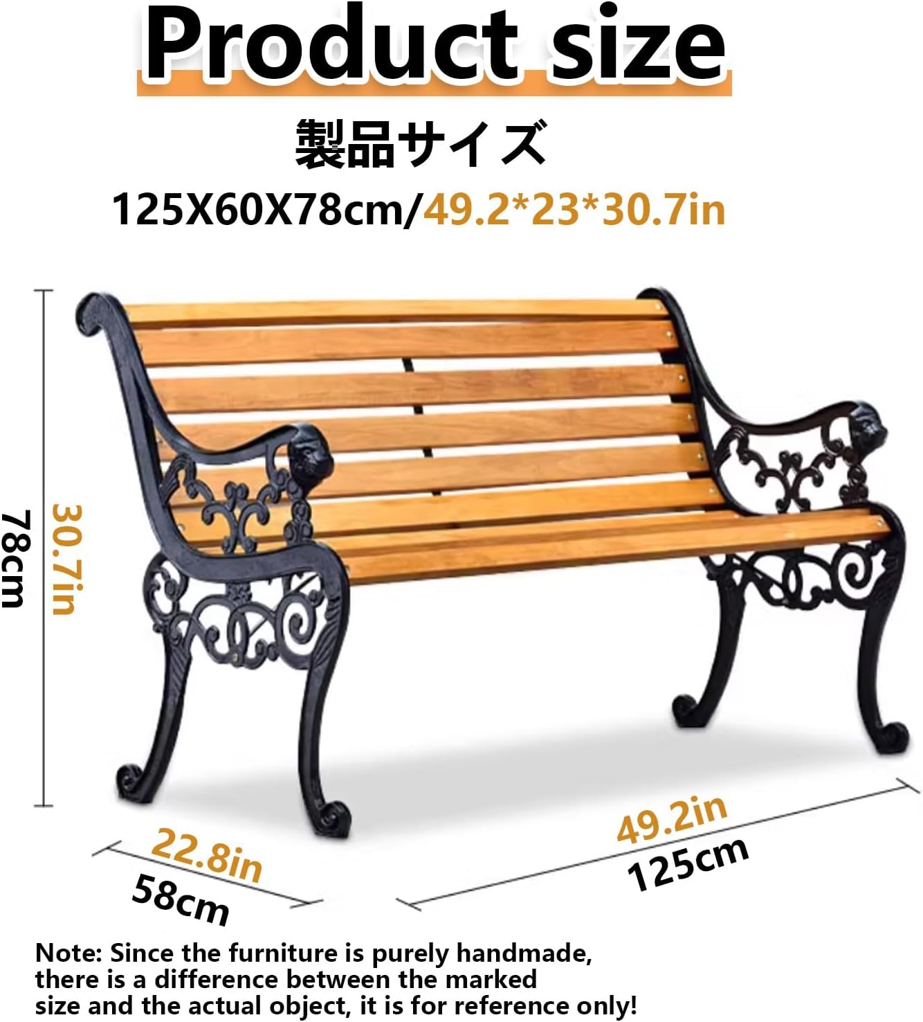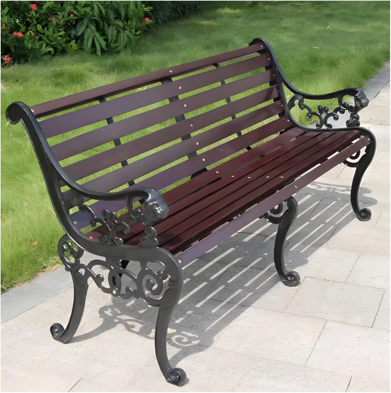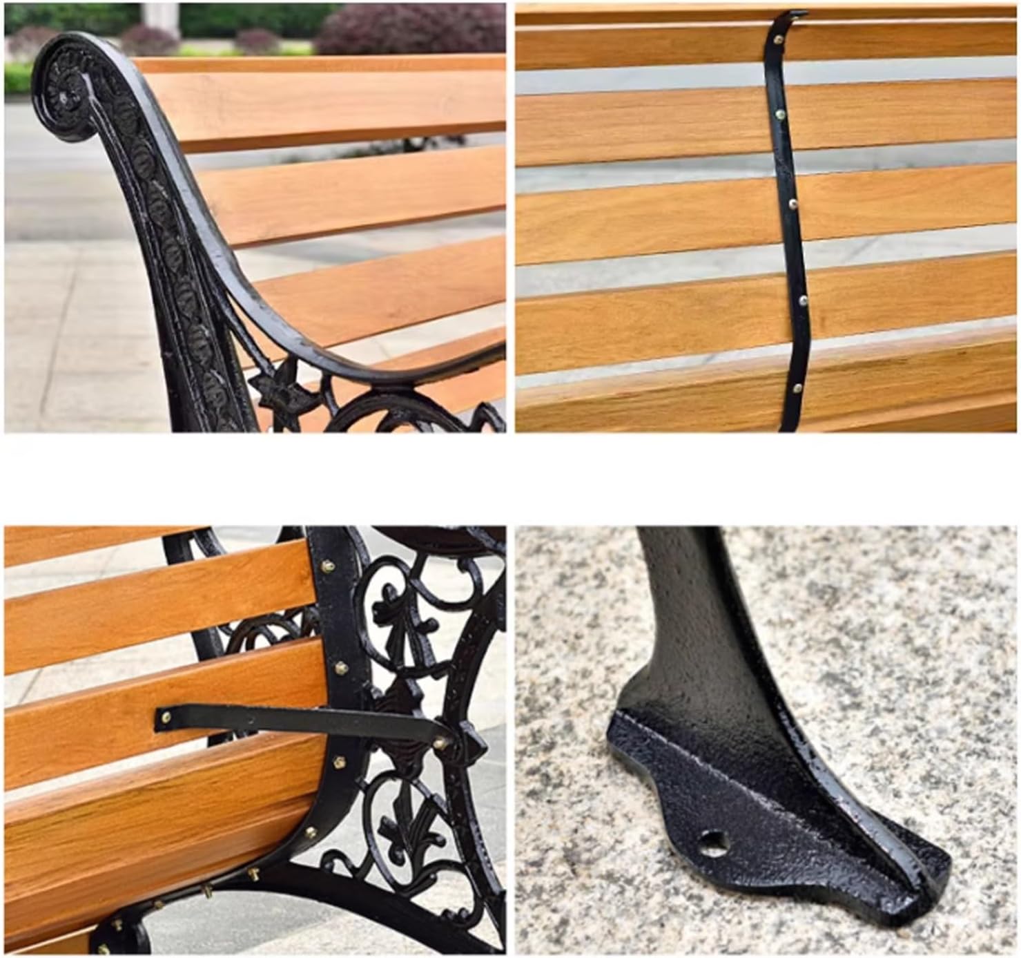 This beautifully designed garden bench will add a touch of elegance to your front or backyard, it will be a great addition to your garden or a nice addition to your trail. Enough space for 2-3 adults, you can enjoy the sun together in the garden or enjoy a cozy barbecue on the patio in the evening, the backrest ensures a comfortable and pleasant sitting position.Product name: Garden Park BenchProduct size: 150X58X78CMProduct weight: 27KGProduct material: cast iron frame and anticorrosive solid woodProduct process: electrostatic spray protective paintCleaning method: easy to clean the chair with damp clothAdditional features: detachable, easy to install, rain and sun protectionApplicable occasions: courtyards, parks, gardens, streets, schools/communities, squares and other placesNotes:Due to differences between different monitors, the product color may vary. Please refer to the actual product.The product may appear differently under various lighting conditions, which is a normal phenomenon. Please refer to the actual product.