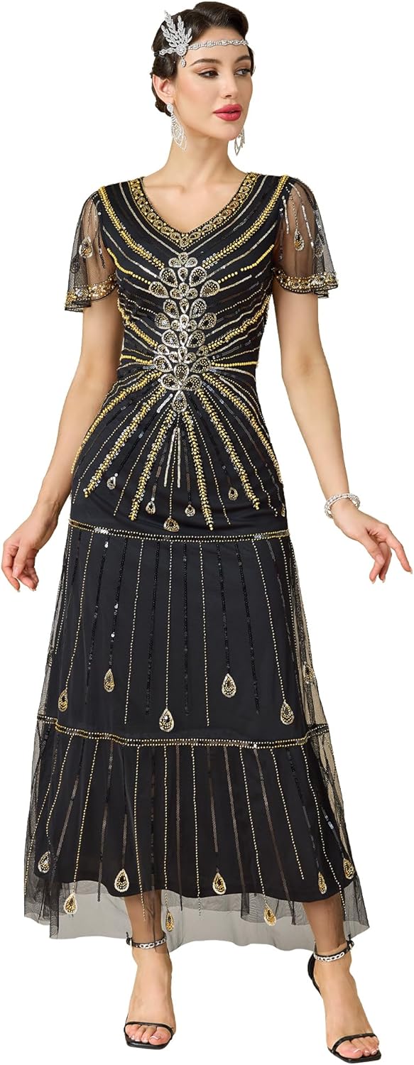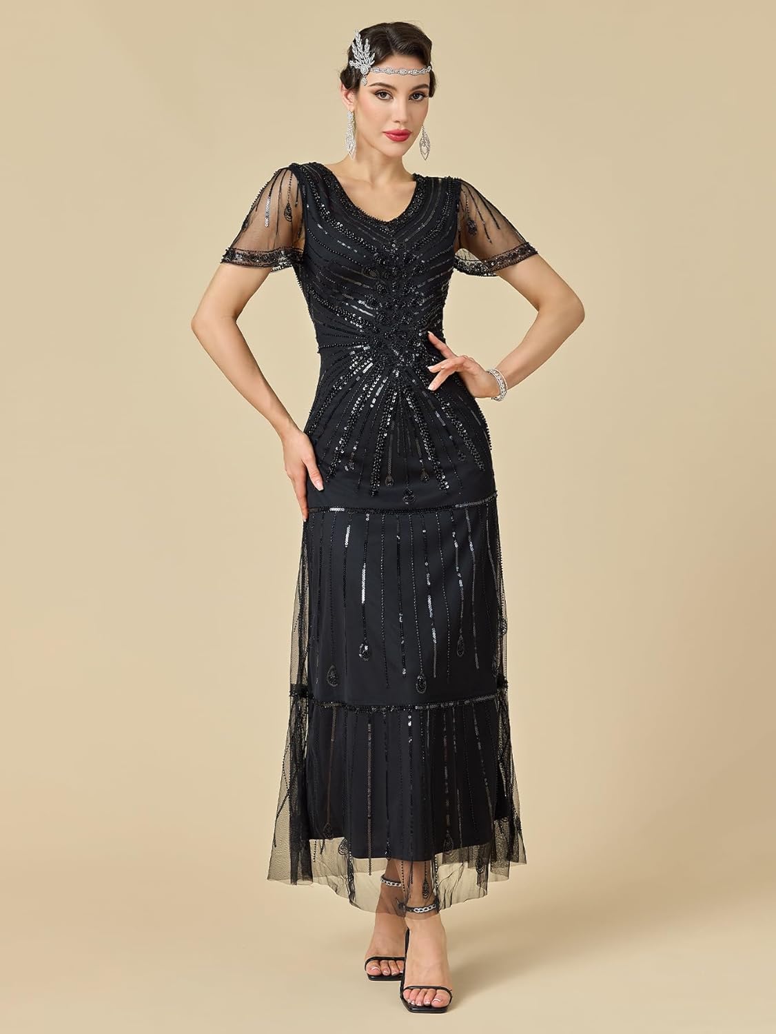 | Style Name | 1920s V-neck Evening Gown Sequin Beaded Maxi Dress for Wedding |