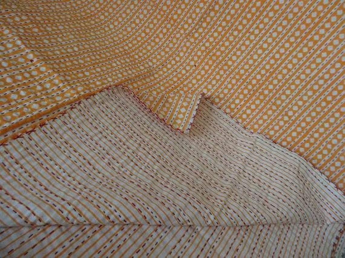 Made with 100% cotton and natural vegetable colors. This piece is of art is completely hand stitched by Women artisan in Rajasthan, India. It can make any room alive with its vivid colors, stunning Paisley print and embroidery, made using traditional and famous kantha hand embroidery method. Made from two thin layer of cotton fabric make this piece of art irresistible and also very comfortable. Adding to it's style, this kantha quilt is reversible and both sides can be used. Kantha is still the most popular form of embroidery practiced by rural women.typically use old saris and cloth and layer them with kantha stitch to make a light blanket, throw or bedspread. These cotton lightweight "Quilts" with a beautiful and colorful Paisley design can be used as 1. Bedspread , Bedding Throw , Blanket Or Quilt 2. A Summer Bed Cover 3. A Throw 4. A Fabulous Picnic Rug 5. Nice Bedroom Quilt , This can fit to a 90 x 108/60*90 wide King/Twin size bed as blanket or throw or can easily fit as bedspread / bed cover to King/Twin bed .